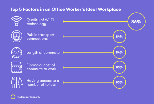 New joint research from Savills flexible office specialist Workthere and property investment and development company, Great Portland Estates plc (GPE), highlights the continued importance of location, transport connectivity and Wi-Fi quality in shaping London’s flexible office market. The London Flex Market Report, which is based on insights from 2,000 office workers and explores the key drivers of workplace satisfaction, ranging from location and commuting preferences to productivity, wellbeing, and daily habits, found that 84% of respondents view transport links as critical, ranking just behind WiFi quality (86%).